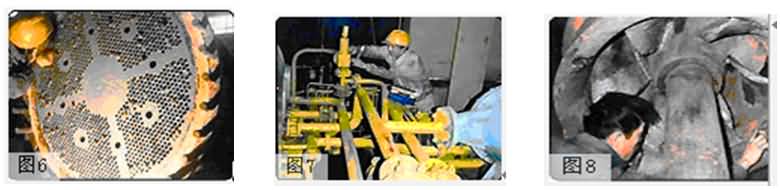 图6: 冷凝器端板腐蚀修复:由于水垢造成大面积锈蚀、堵塞、破损。图为使用耐腐蚀涂层对其工作表面刷涂,制作保护层。胀管处出现腐蚀,结果导致内漏,连接处由于铜管与管板为不同材料的金属,产生电化学腐蚀需要修复。采用高效清洗剂+耐腐蚀涂层完全根治了泄漏,用高效清洗剂去除污物,耐磨胶粘剂与金属高粘接强度防止腐蚀的进一步恶化,并完全杜绝了腐蚀的再次发生。