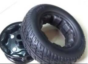 微孔聚氨酯弹性体轮胎是一种不必充气的免充气轮胎,是采用微闭孔发泡技术将高分子聚合材料形成互不相通而又致密的微小气室,内部充满高弹性海绵体状的轮胎。