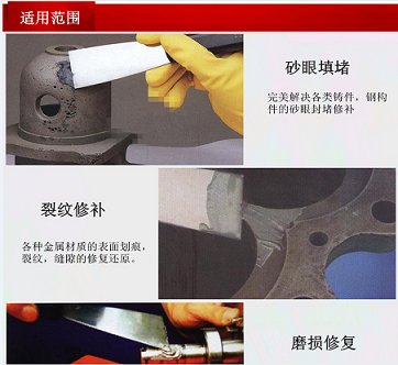 适用于钢铁零件磨损修补及划伤、裂纹等损伤修复。机械强度高;抗磨损,耐酸碱腐蚀;能与金属完美结合。