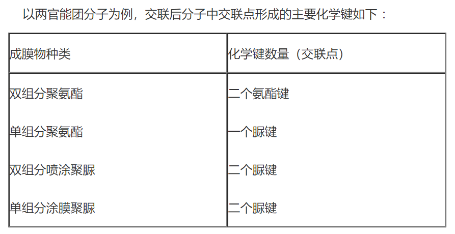 双组分聚氨酯交联后,交联点形成氨酯键;单组分聚氨酯、单组分聚脲、双组分聚脲固化交联后交联点均形成了脲键。但单组分聚氨酯只有一个脲键。双组分聚氨酯反应过程中极少量的水份也会与NCO反应,产生极少量脲键。