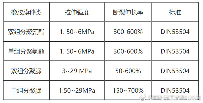 上述表中,单组分聚氨酯在交联固化过程中,在水份作用下二个NCO产生一个二氧化碳分子,生成一个脲键。而单组分聚脲在交胶固化过程中,在水份作用下,解除封闭的胺基,而形成二个脲键。正是由于单组分聚脲和双组分喷涂聚脲在交联后交联点上形成二个脲键,其本体强度大大高于聚氨酯。而单组分聚氨酯交联后形成了一个脲键,其强度低于具有两个脲键的聚脲,另外其产生二氧化碳气泡也是造成强度低的一个原因。双组分聚氨酯固化后形成了2个氨酯键。上述为一种理想状态,实际交联反应要复杂得多。聚脲中有扩链剂,聚氨酯中也可有扩链剂,扩链剂均参与反应。另外在高温潮湿环境下,还有水份参与竞聚反应。反应过程中所选用分子种类、分子链大小以及扩链剂甚至包括施工过程等,对固化后的橡胶膜均有影响。